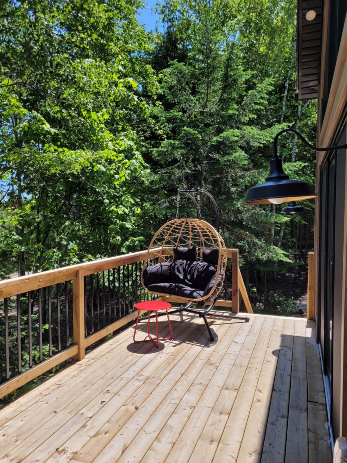 Inside, the cottage offers: -2 comfortable bedrooms with queen-size beds -2 full bathrooms -A large, bright living room -A fully equipped, practical kitchen -Abundant windows on all walls to make you feel like you're surrounded by nature The outdoor spaces are designed for relaxation and comfort: -A fully enclosed rear balcony for mosquito-free dining, whatever the weather -A front balcony that gets the morning sun, perfect for enjoying your coffee at the start of the day -A specially designed campfire area for relaxing in the evening -A garage available for storing your ATVs or snowmobiles with direct access to the trails For your moments of relaxation indoors: - High-speed Internet - A collection of over 200 DVDs - Bedding, towels, and basic supplies (dish soap, toilet paper, etc.) included